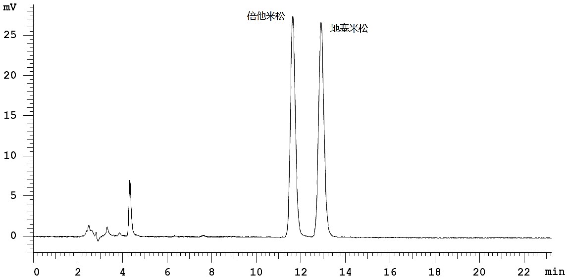 注:如將流動相中有機相比例進一步降低(約為 28.5%),使保留時間后移,倍他米松與地塞米松的分離度將進一步得到提高,從而延長色譜柱的使用壽命。